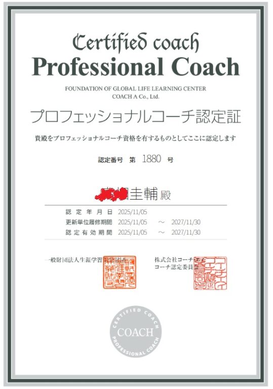 で、先月無事に「(一財)生涯学習開発財団認定プロフェッショナルコーチ」に合格しました。